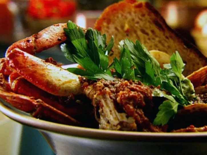 3) With 10 minutes to go, turn the heat up and add the crabs and clams to the broth and steam until open, discarding any un-open ones. Reduce the heat and just prior to serving, add the shrimp and shut off the heat so they don't get over cooked. Remove and discard bay leaves.