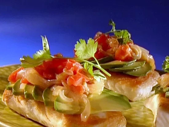 6) To serve, set garlic sourdough toasts in the bottom of a flat bowl. Top with halibut then ladle over cioppino. Top with a spoonful of reserved garlic butter. Garnish with fresh flat-leaf parsley and serve.