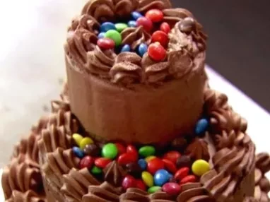 Pipe any remaining frosting decoratively around the cake and decorate with the candy-coated chocolates.