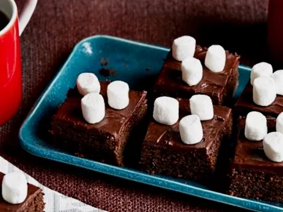 3. Bake until the brownies begin to pull away from the edges of the pan and are set in the center, 30 to 35 minutes. Remove from the oven, immediately sprinkle with the remaining chocolate chips, and let stand until they are very soft, about 5 minutes. Spread the melted chips evenly with a spatula, and let cool for about 10 minutes. Use the foil to lift the brownies out of the pan, and let cool completely on a rack. Cut into 24 squares, and top each with 3 mini marshmallows.