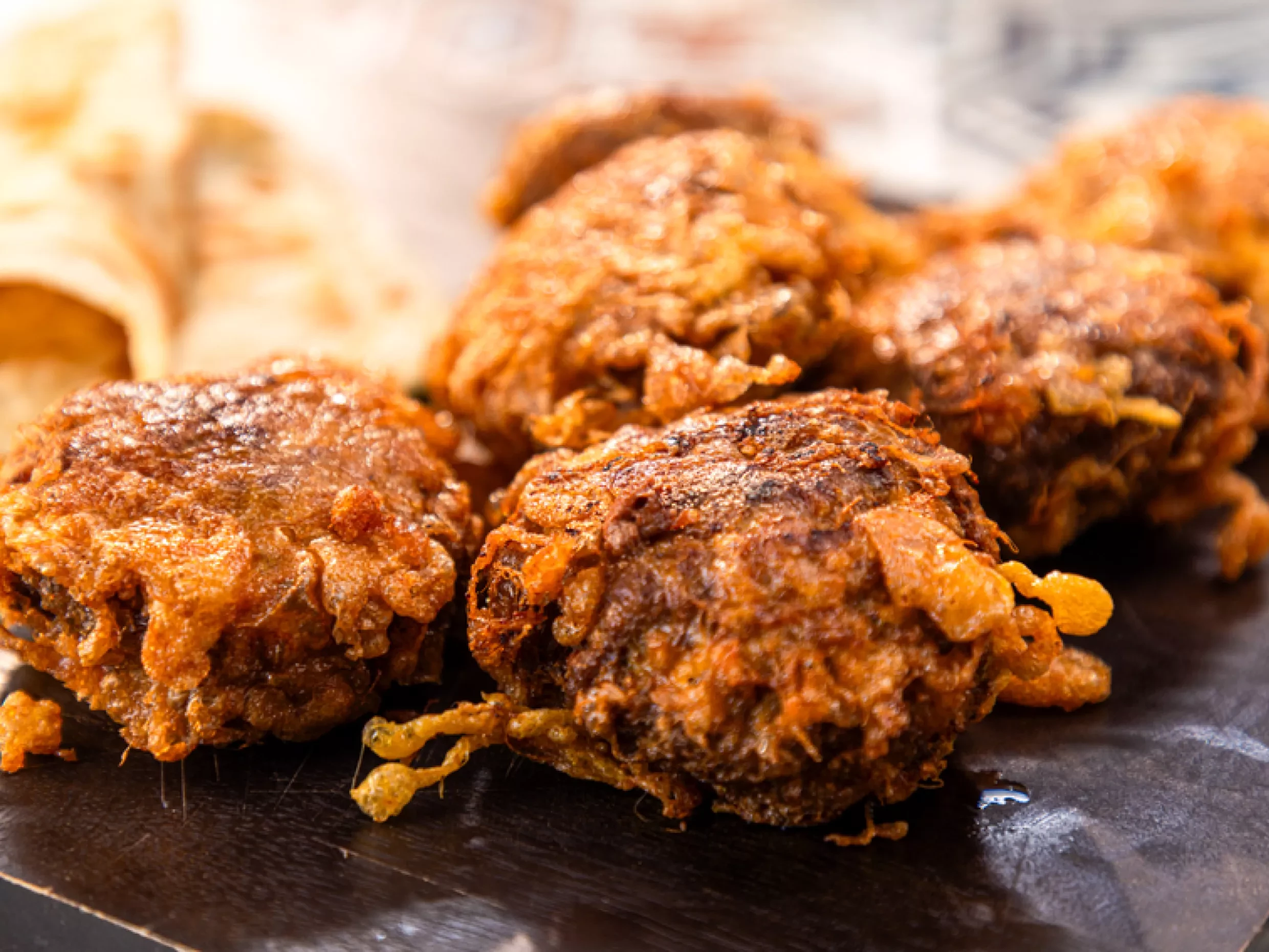 Jali means "web" or "mesh" in Bengali and describes the distinctive design on top of the meat patty created by the egg wash, which resembled the threadlike web pattern of a jali. Great to make for entertaining, jali kabab is also suitable for gatherings with children or adults with low chile tolerance, as you can halve the chile here without compromising much on flavour.