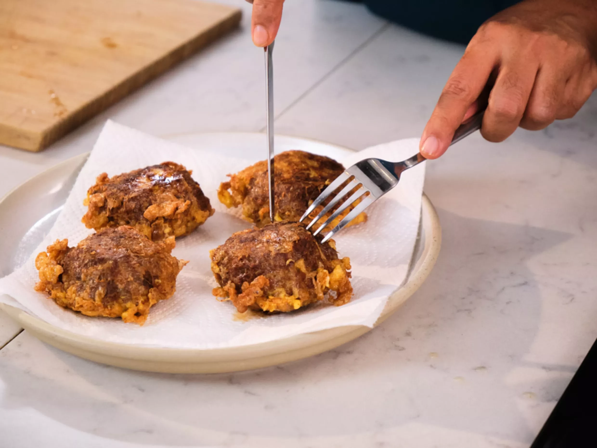 - Wait for each kabab to brown and cook on one side before turning them over. With a pastry brush dipped in the beaten egg, drizzle a threadlike zigzag pattern on each kabab. Cook on both sides until each kabab is dark brown and cooked all the way through. Reduce the heat under the pan if the kababs brown too quickly-the insides must cook too. Remove with a slotted spoon to rest on paper towels.