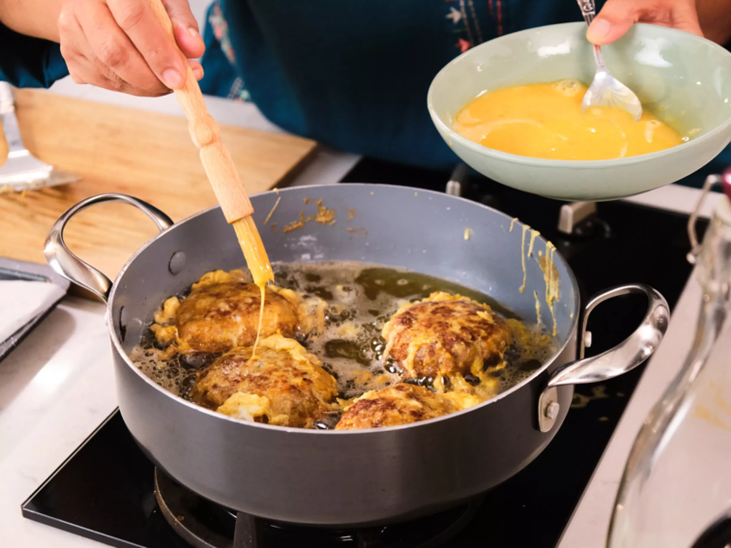 - Whisk the three remaining eggs. Remove the kababs from the fridge. Warm a deep, heavy-based frying pan over a medium-high heat, before adding a 1-in (4-cm) depth of vegetable oil. When it reaches a medium- high heat (one way to test this is to drop in a small cube of bread-it should brown in 30 seconds), dip a kabab into the beaten eggs and slide into the oil. Ideally, you should fry no more than 2-3 kababs at a time. Adding too many will drop the temperature of the oil and cause the kabab to disintegrate during cooking.