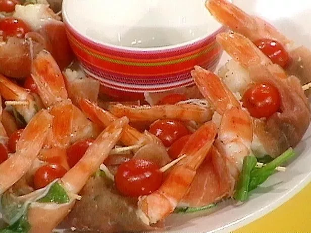 3) To assemble the prawns, place one prawn on each pile of rocket leaves then wrap the leaves up with the prawn using a piece of the prosciutto. Assemble six pieces at a time, like an assembly line. Nest a grape tomato into the curve of the prosciutto-wrapped prawn and secure into place with a cocktail stick.