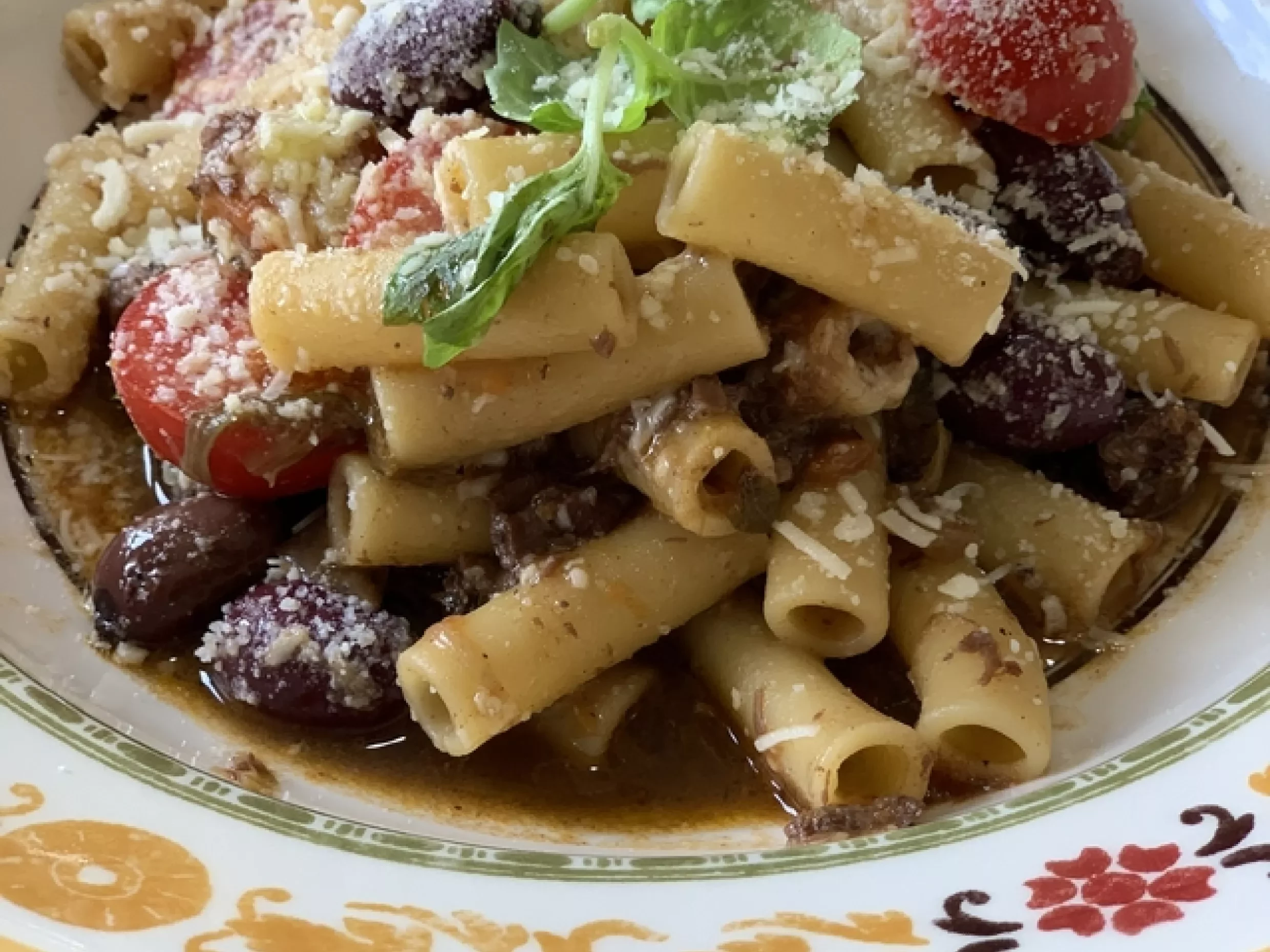 - Add the ragu to the cooked pasta and stir to combine. If the sauce is too thick, add some pasta water to thin it out. Finish with the olives, fresh tomatoes, Parmesan and extra-virgin olive oil. Top with the whole basil leaves. Serve immediately.