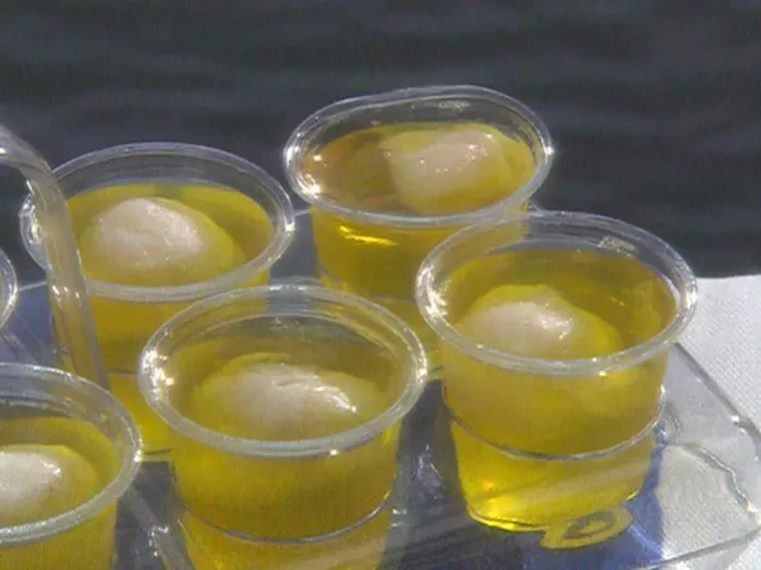 - Pour can of lychee fruit into a strainer. Reserve 30ml lychee juice.