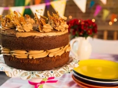 Pipe some buttercream swirls on top, place a caramelised walnut and piece of caramel on each swirl, arrange the candles in the middle of the cake and serve.