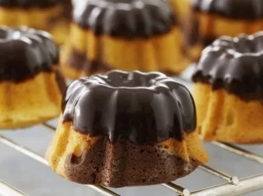 Spoon out a third of the batter into another bowl. Stir the melted chocolate and the cocoa powder into this and stir until blended. Spoon the batter into 2 piping bags fitted with a plain tip (or no tip) and pipe vanilla and chocolate batter intermittently into each mini bundt pan. Use a bamboo skewer to swirl the batter just a little. Bake the cakes for about 20 minutes, until a skewer inserted in the centre of the cake comes out clean. Cool the cakes for 30 minutes then turn the cakes out to cool completely before glazing.