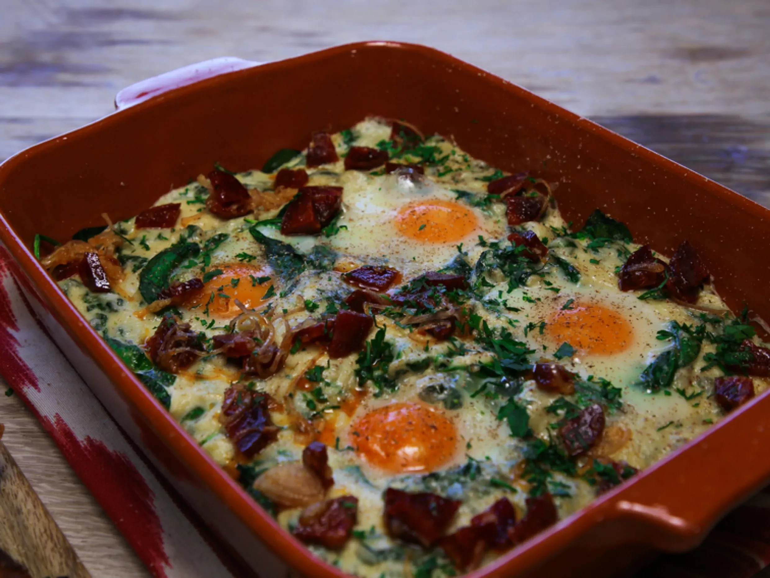 Marcus Wareing's Baked Eggs and Creamed Spinach, Chorizo and Parmesan