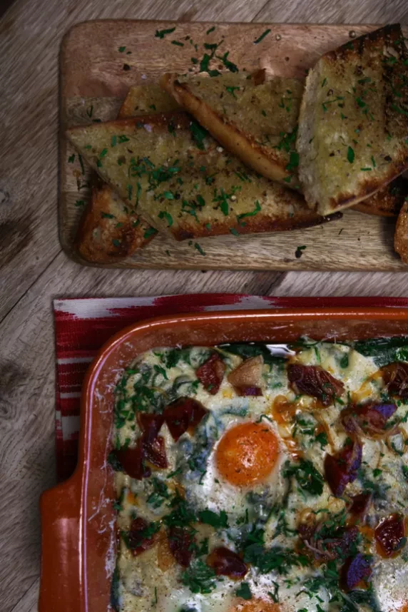 Served with sliced baguette, Marcus Wareing's eggs are baked to perfection and combined with creamed spinach, chorizo, and parmesan for a truly perfect start to the day.
