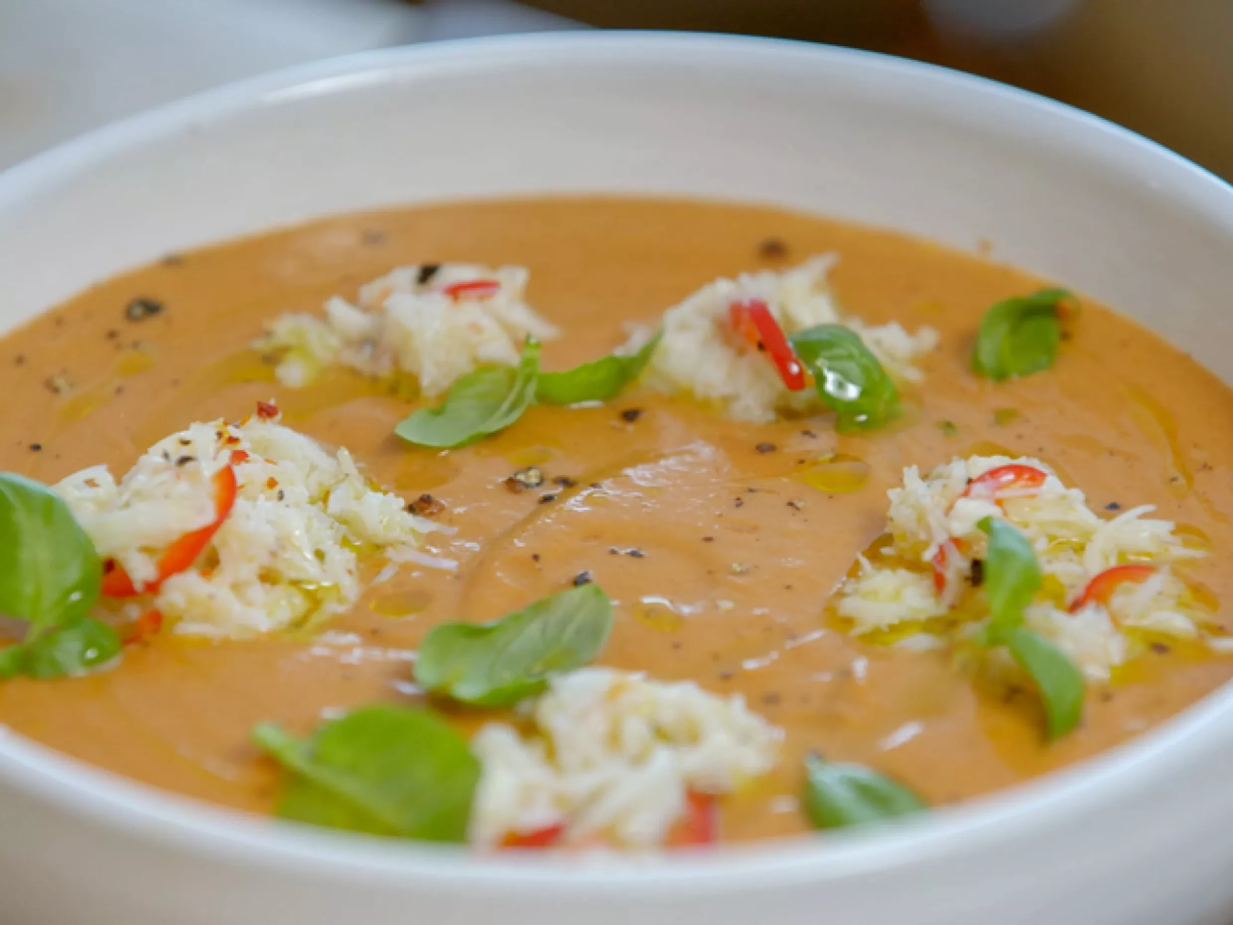 - To serve, ladle the soup into small serving bowls and spoon the crab meat into little piles on top of the soup. Scatter with basil leaves and drizzle with a little olive oil to finish. Serve the cucumber salad and crusty baguette slices alongside.