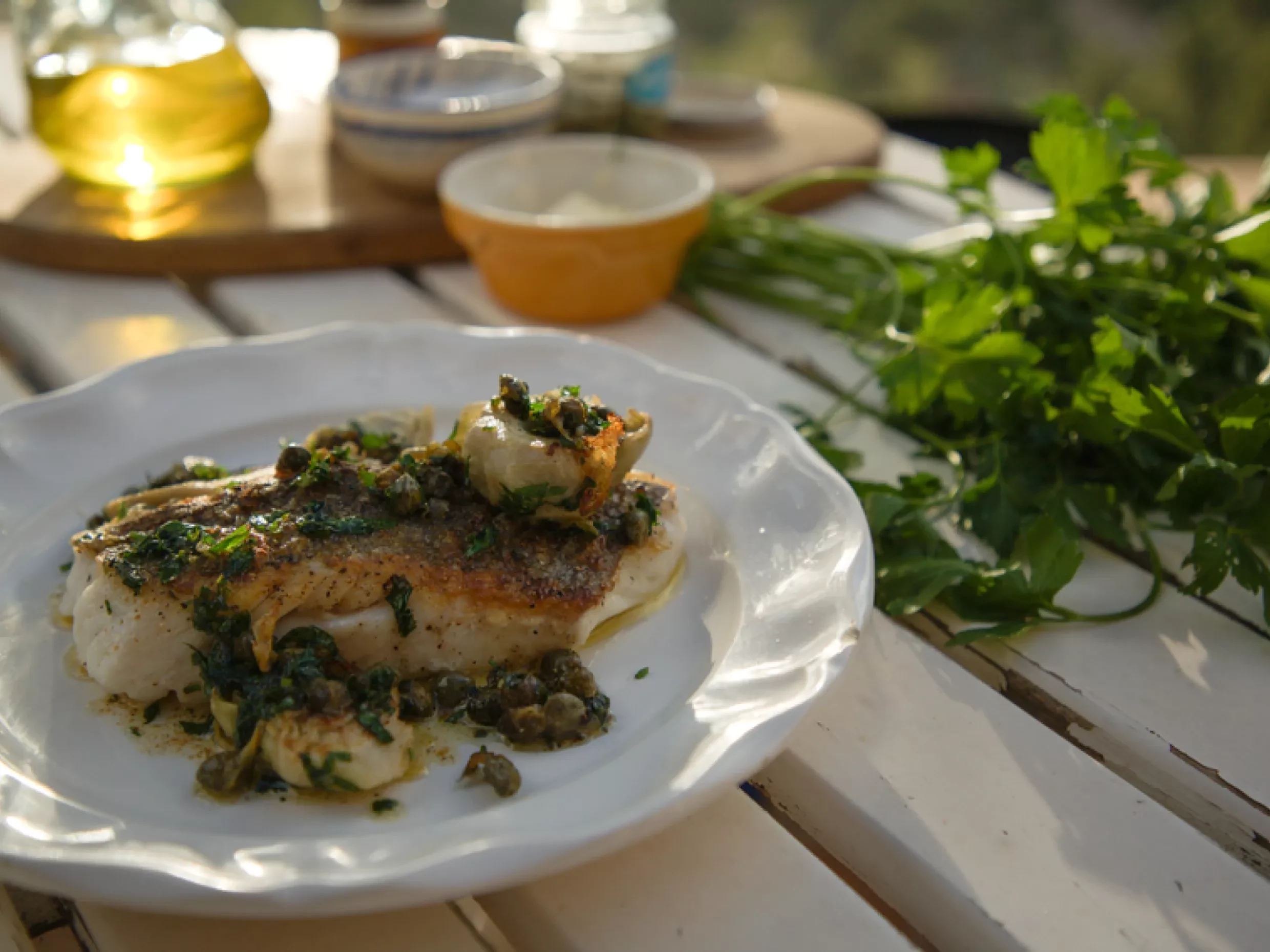 Marcus Wareing's Pan-Fried Hake with Capers, Chargrilled Artichokes and Brown Butter Sauce