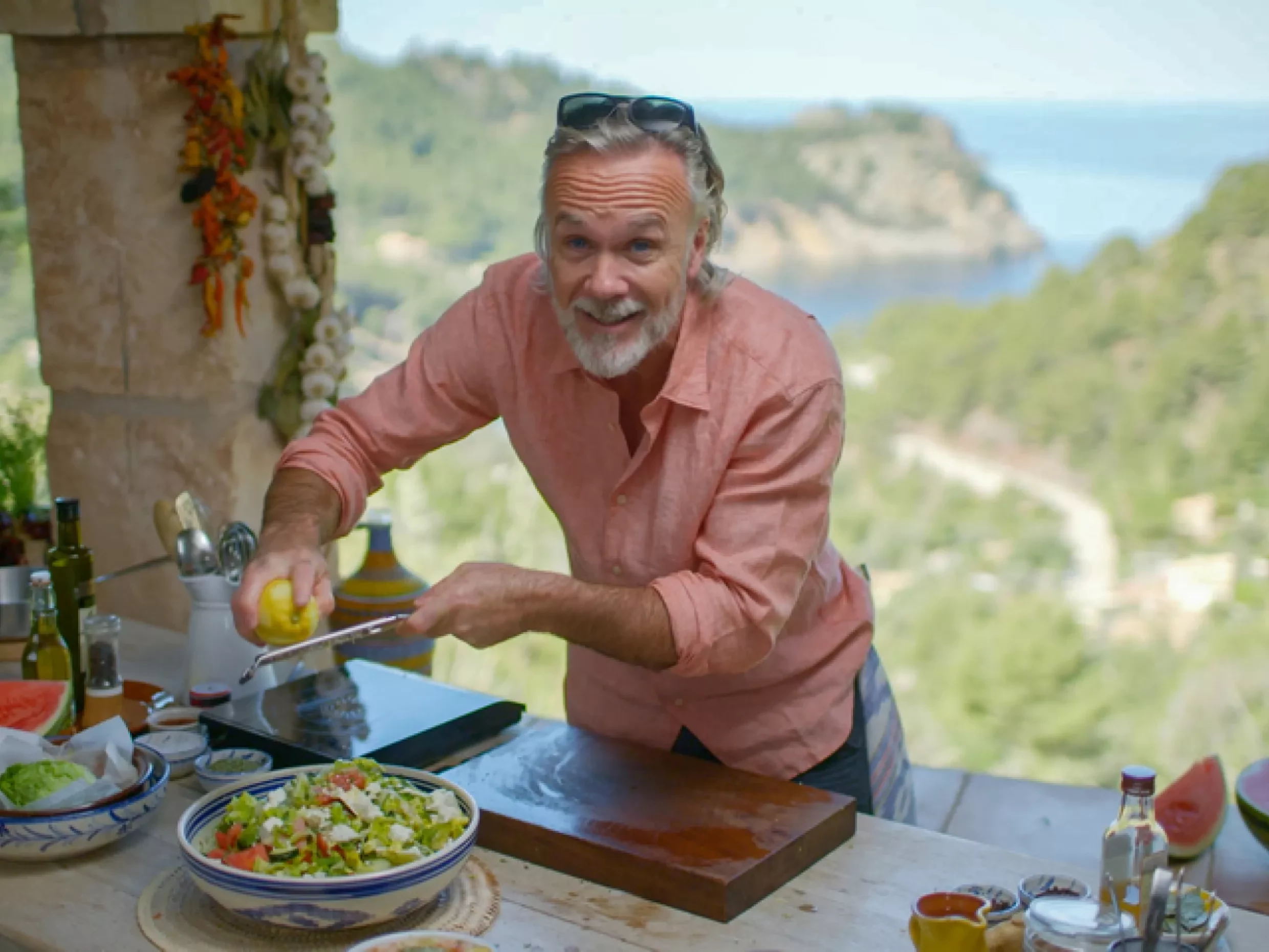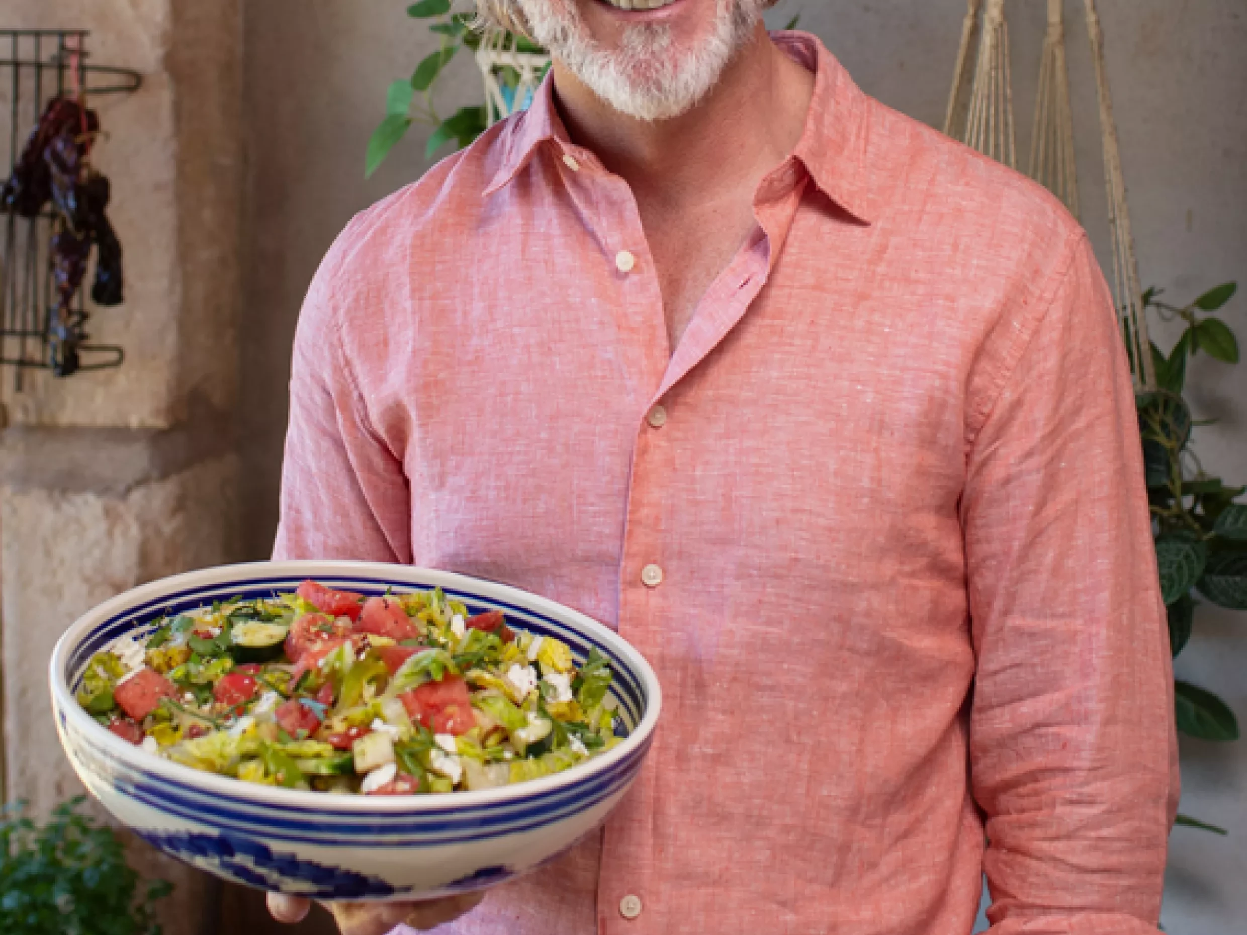 To make the salad, cut the pink watermelon flesh into chunks and dab dry with kitchen roll. Place into a large serving bowl.