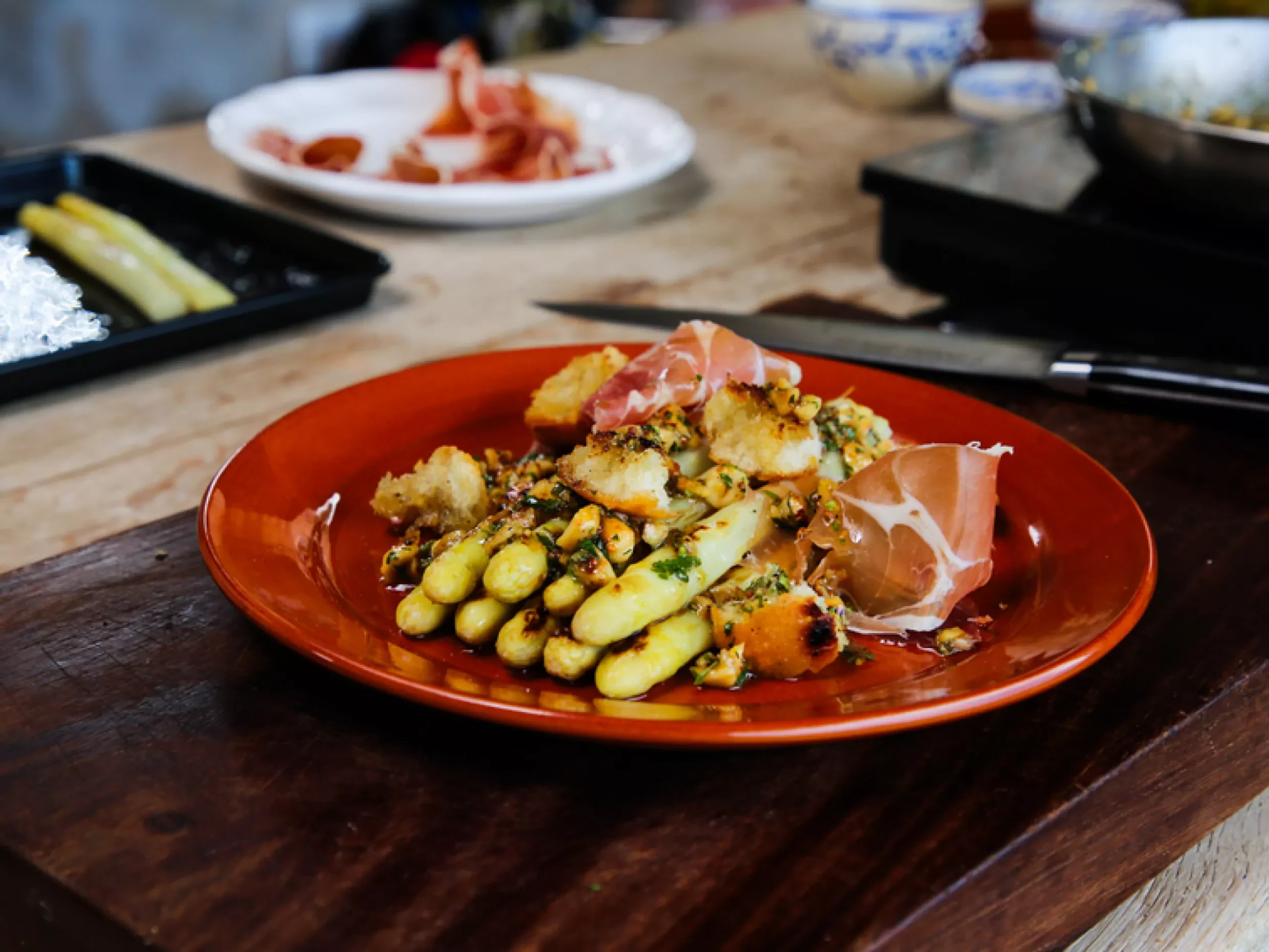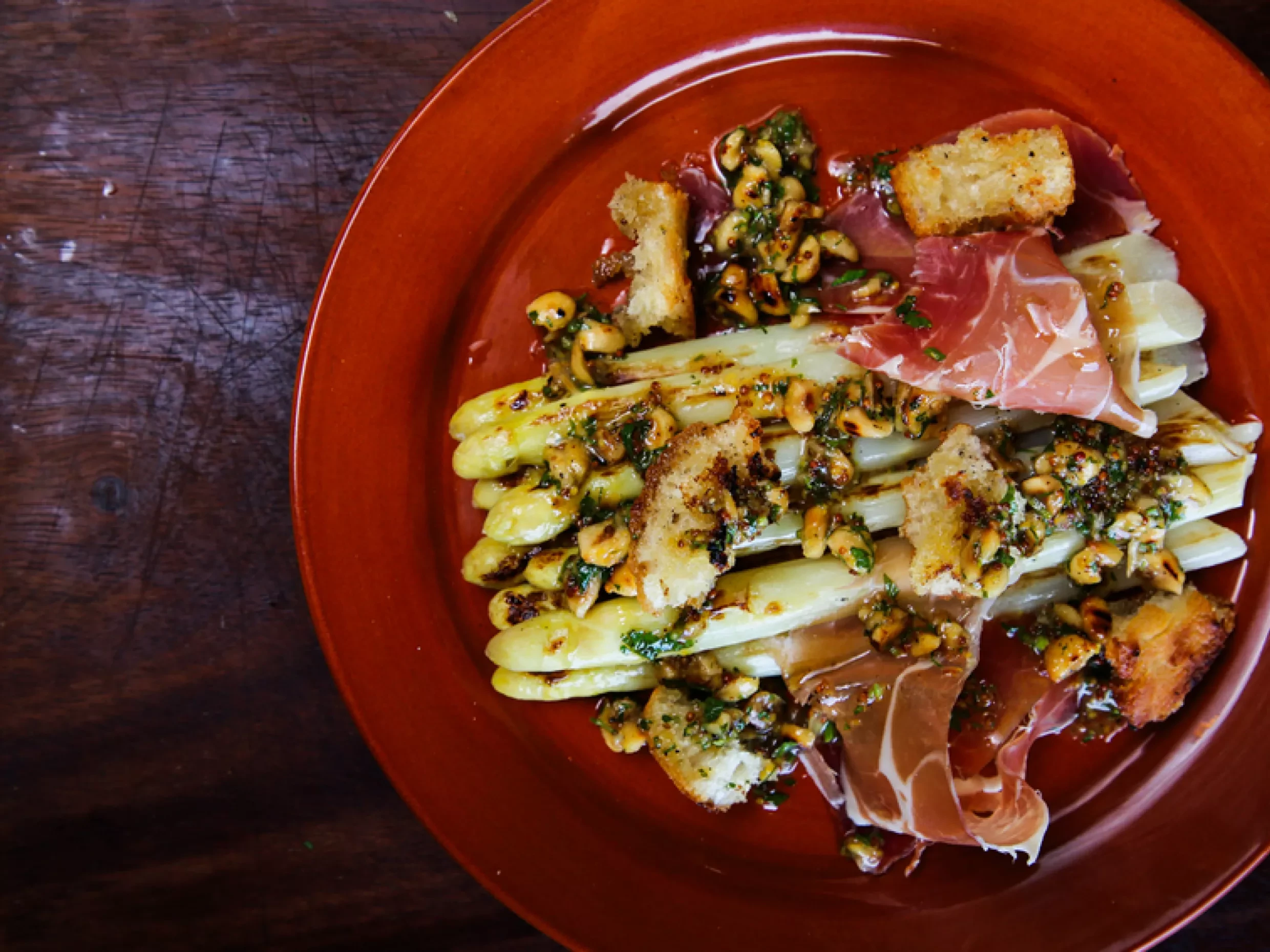 - To serve, add the asparagus to a plate and arrange with a few slices of the serrano ham and croutons on top. Generously drizzle with the vinaigrette and enjoy.