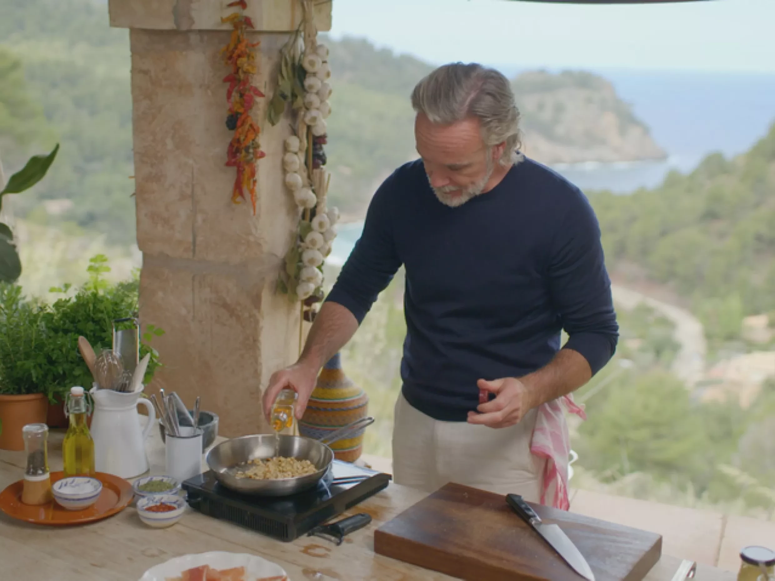 - Heat a frying pan on the grill if you have one, or on the hob if cooking at home. Drizzle the drained asparagus with olive oil and a pinch of salt and a crack of pepper, then add to the frying pan on high heat, turning to get an even char on each side - about 20-30 seconds. Remove from the frying pan and leave to cool on a tray.