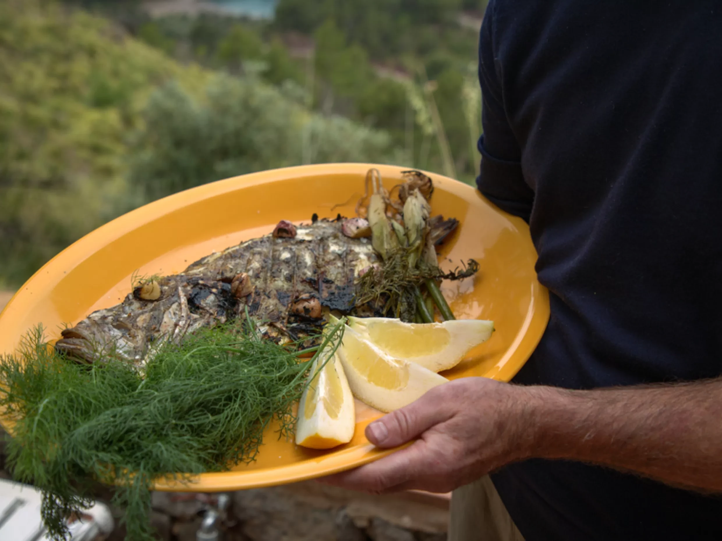 - Remove the fish and tin foil parcel from the fire. Plate up the fish on a large serving platter and frame with the roasted fennel and lemon wedges, garnish with fennel fronds and garlic cloves on top. Drizzle olive oil over the fish and serve alongside the potato salad.