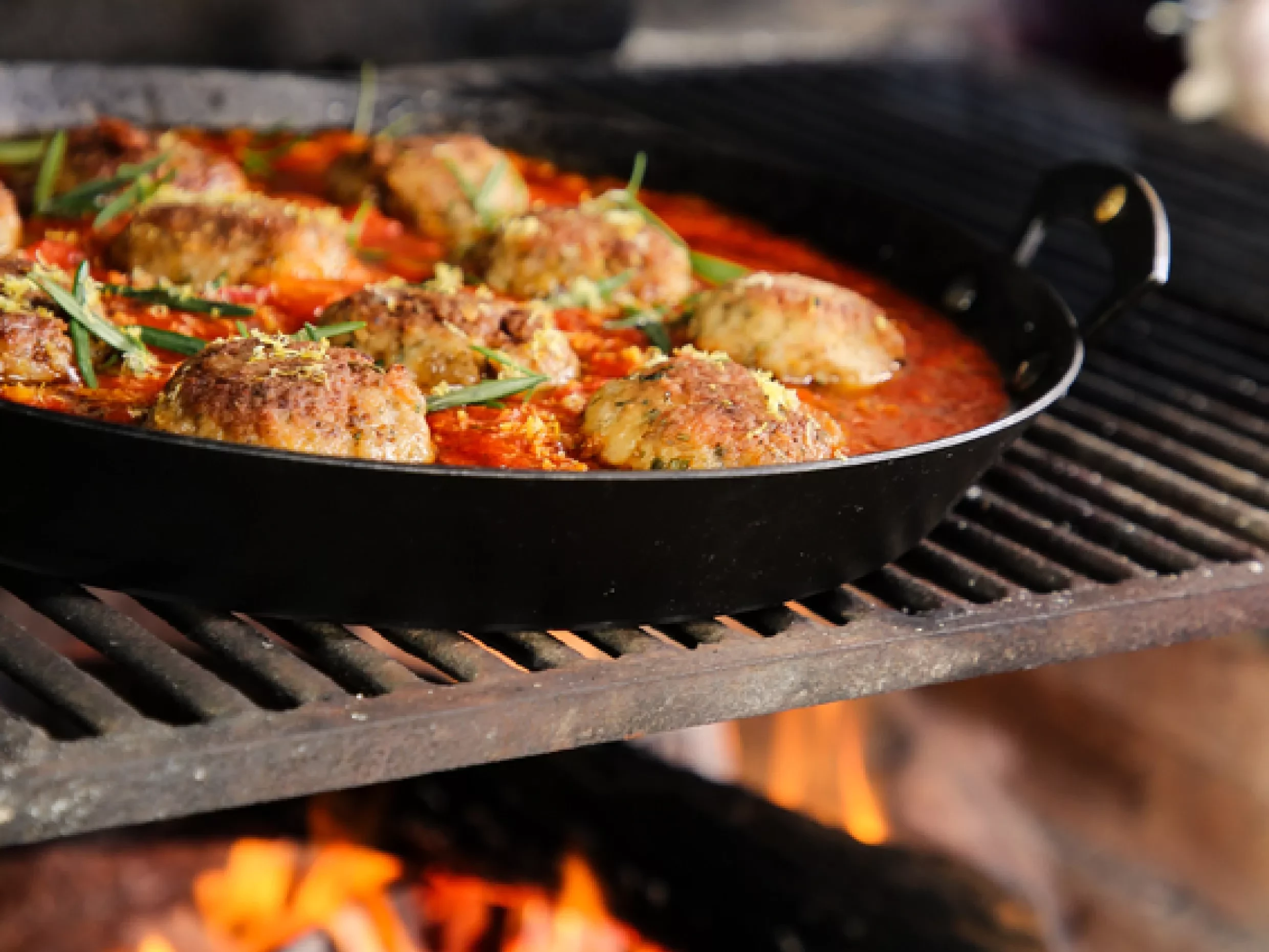 - To serve, transfer the tomato sauce into a cast iron serving dish. Add the meatballs on top of the sauce and garnish with rosemary and a little lemon zest.