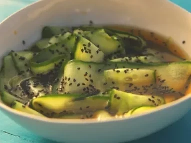 2. Mix marinade ingredients together and pour over the cucumber ribbons and leave to marinade for 15 minutes or up to on hour.