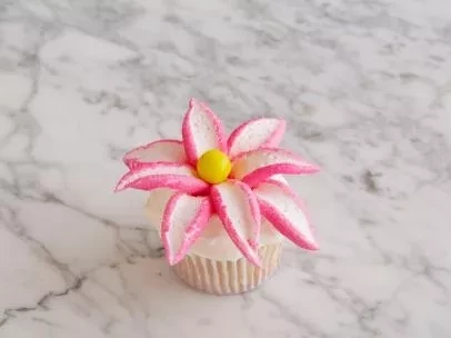 Arrange 4 petals at 12, 3, 6 and 9 o'clock around the cupcake. Put the remaining 4 petals on top and between them. Put the gumball in the center.