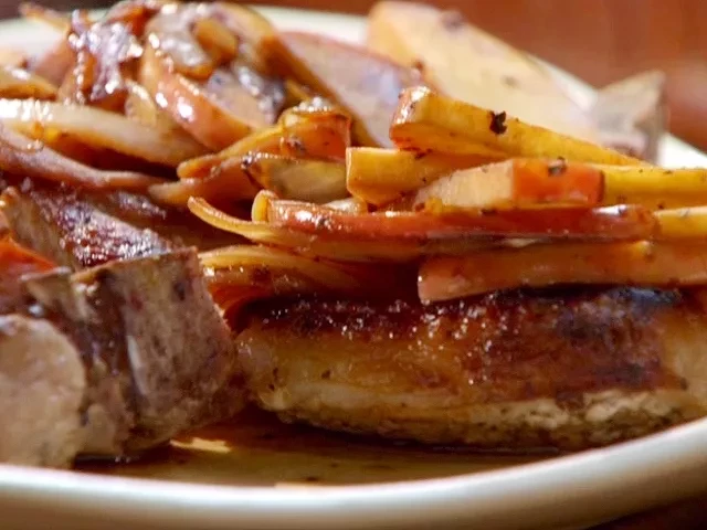 3) Serve chop covered with apples and onions, gravy poured down over top, sweet potatoes alongside.