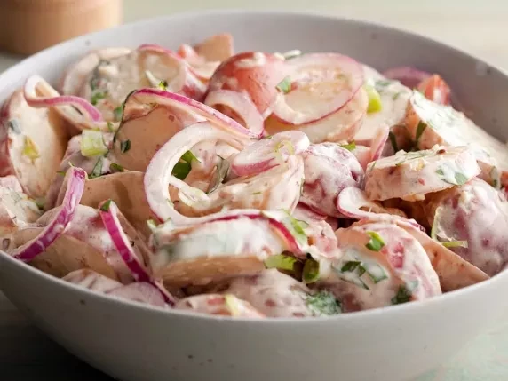 3) Stir together the remaining ingredients in a medium bowl. Pour the mixture over the warm potatoes and mix gently until combined, mashing the potatoes slightly.