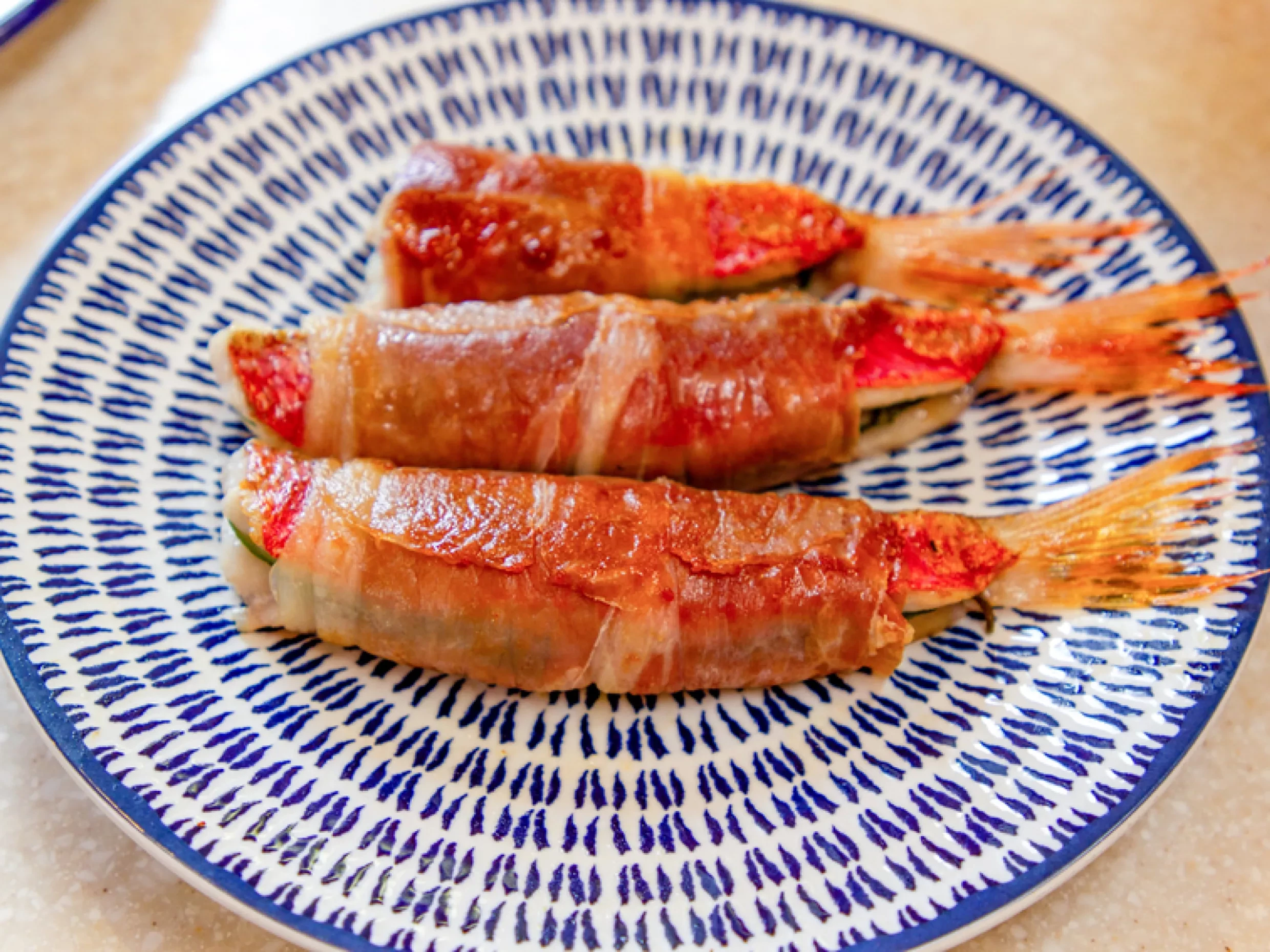 - Open up the red mullet, season with a little salt then lay 3 basil leaves on top of one side of each fish. Fold the top fillet over then wrap each pair of fillets in a slice of ham. Set aside until you’re ready to cook.