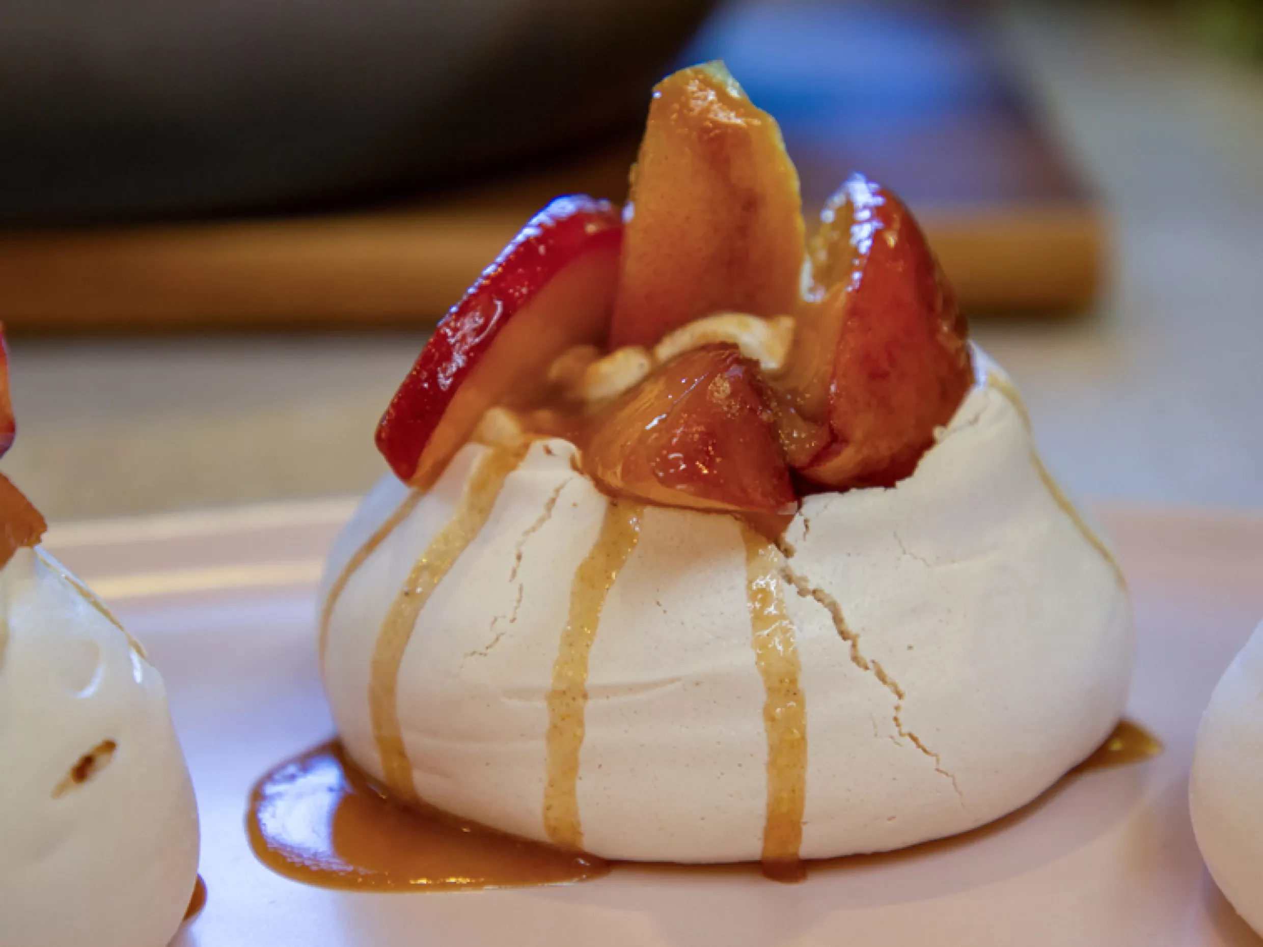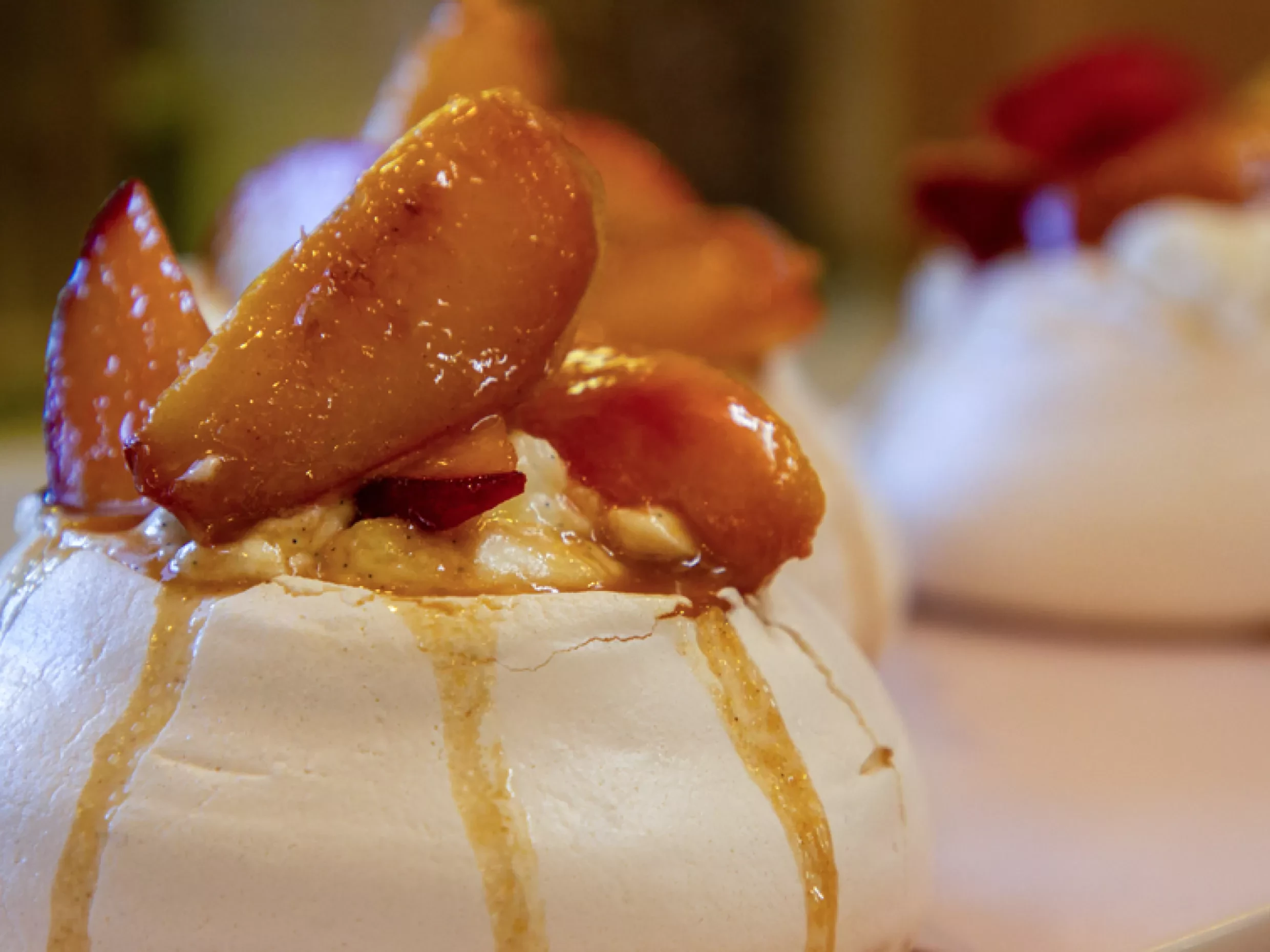 - To serve, dollop some cream into each pavlova then pile up with the cooled peaches and a drizzle of cooking juices.