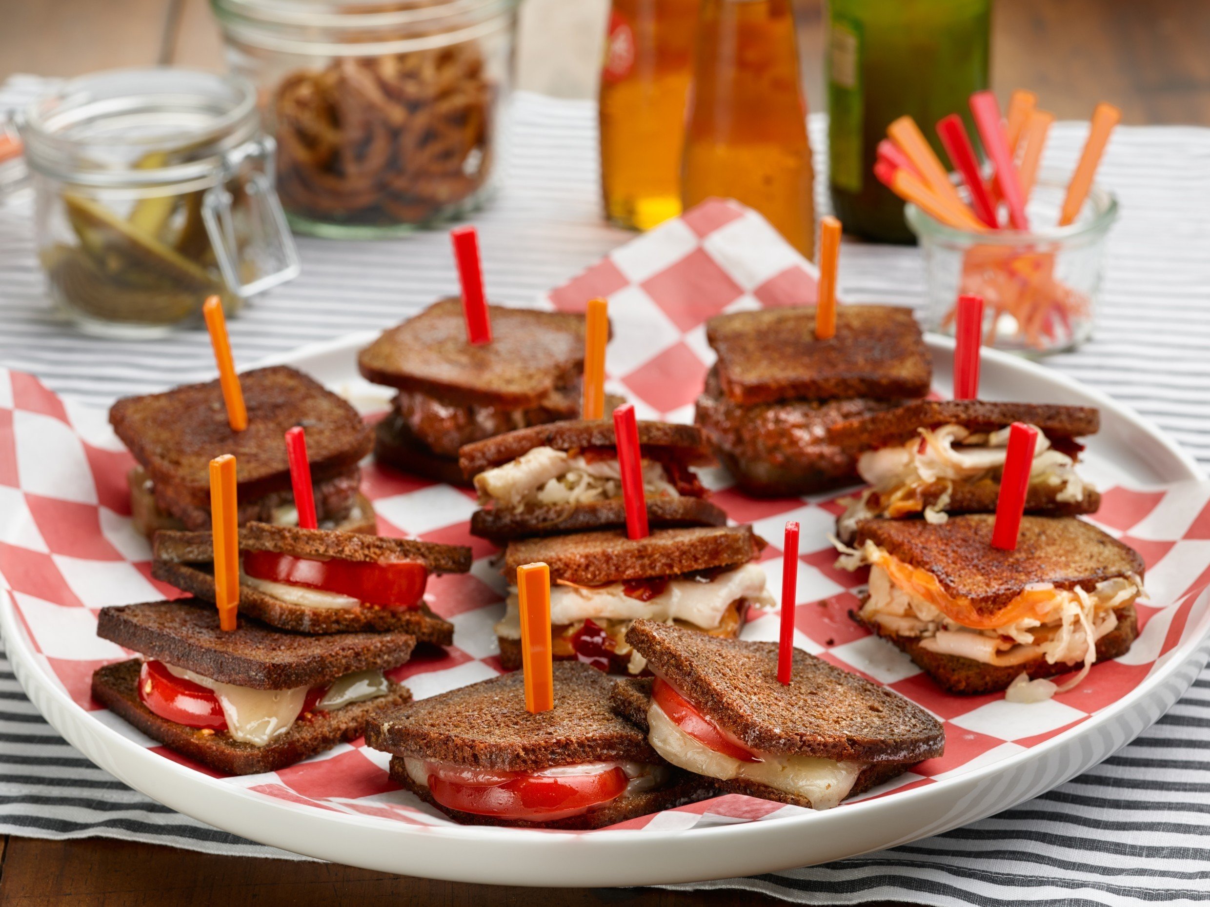 7. Remove mini Rachael's and grilled cheese and tomato sandwiches from the warm oven and serve all on trays with mini pickles and mini pretzels.
