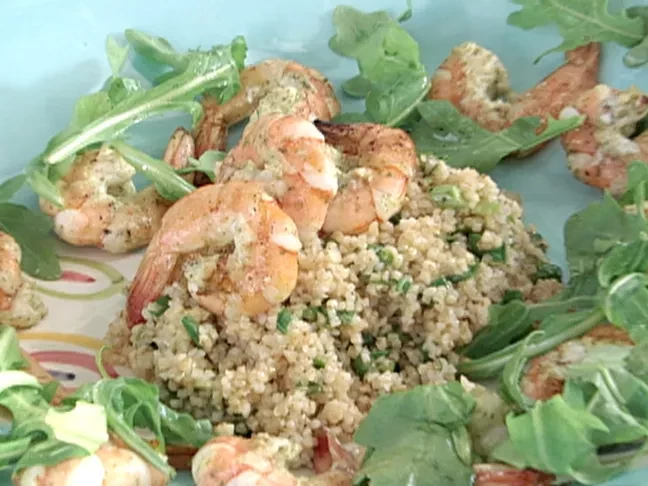 Mint marinated grilled prawn tabbouleh salad