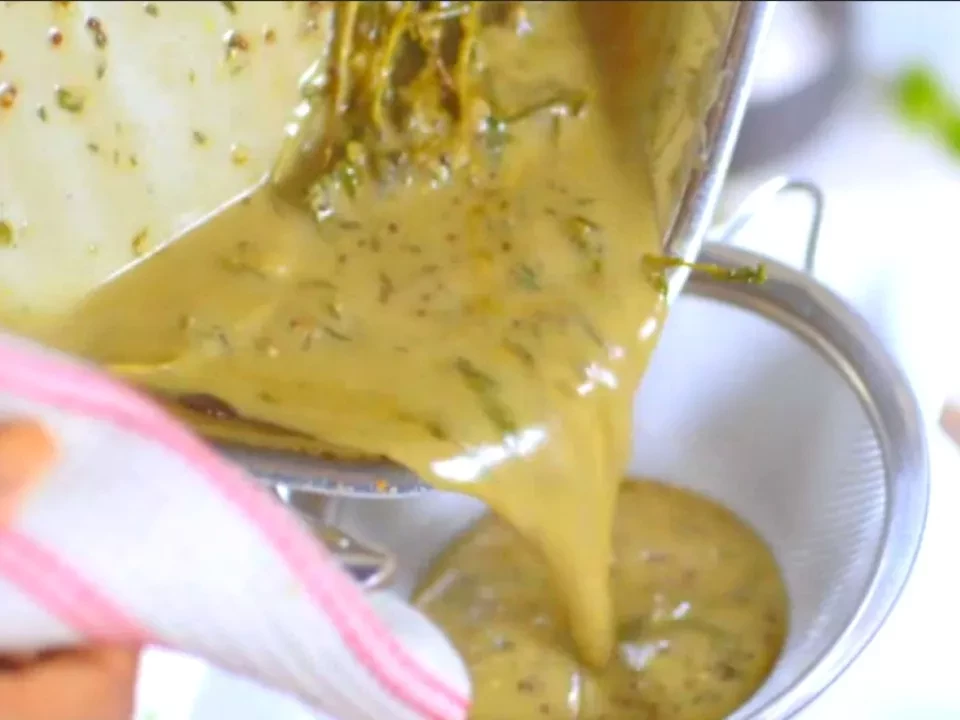 Add the mustard, mint leaves and some crème fraiche, and some honey for taste.