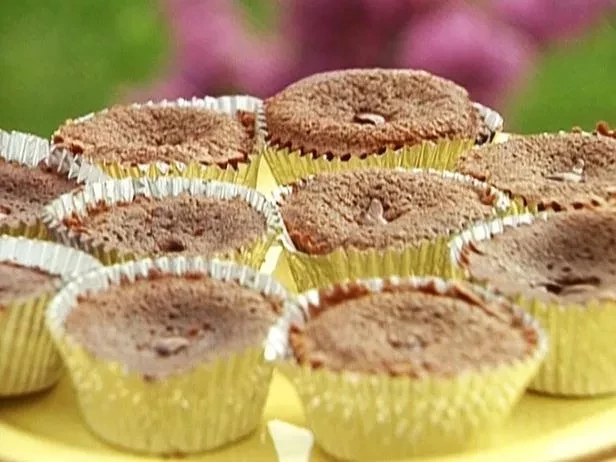 7) Immediately, while hot, add a chunk of the remaining chocolate in the center of each, by gently pushing it through the top of the cake in the center. Cool the tin on a rack for 10 minutes and then unmold them.