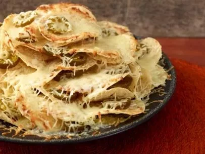 Lay the whole tortilla chips in an ovenproof dish. Sprinkle over the cheese, add jalapeno slices of using and repeat the process until you have 3 layers. Bake until the cheese has melted.