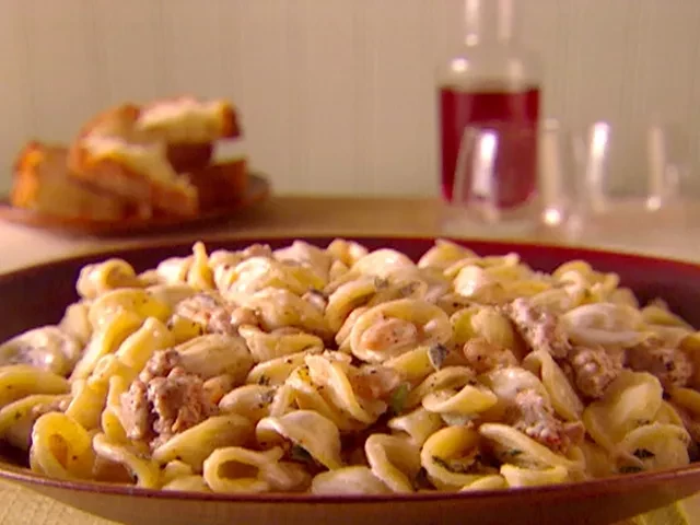 3) Continue cooking until the sausage is golden and the onions are tender. Add the beans and oregano cook for 2 more minutes. Add the pasta cooking liquid and stir, scrapping up any brown bits from the bottom of the pan. Add the mascarpone cheese and stir until it dissolved into a light sauce. Add the salt, pepper, and hot pasta.