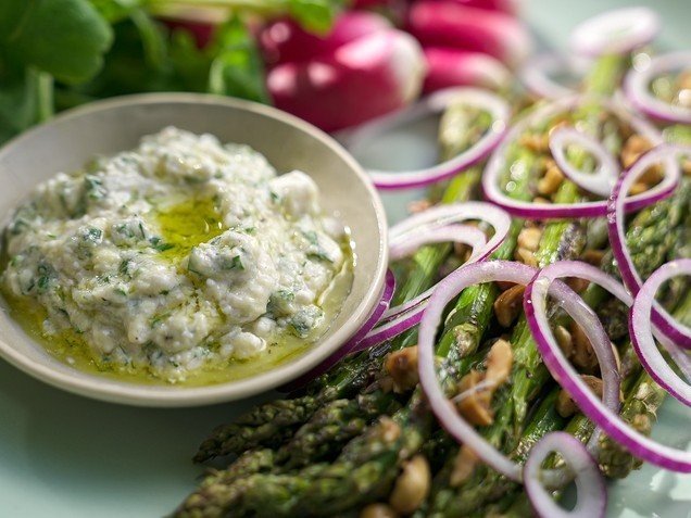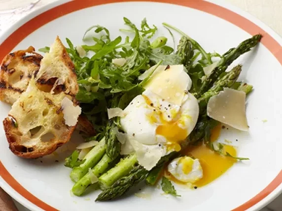 5. To assemble the salad: Toss the rocket with half of the lemon juice, a drizzle of olive oil and a pinch of salt. Gently toss the salad until coated with the lemon and olive oil. Add more lemon juice and oil if needed. TASTE IT! The salad should be dressed and flavorful but not soggy. Divide the rocket among 4 individual plates. Arrange the asparagus on top of the rocket on each plate.