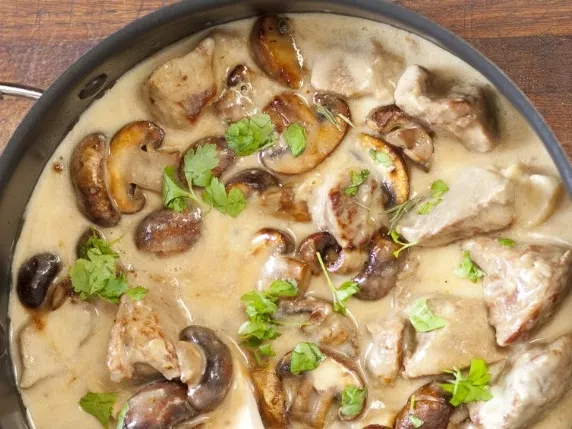 3. Heat the oil in a large casserole dish and fry the pork fillet for 5-6 minutes until lightly browned. Add the onion, garlic, chestnut mushrooms and dried mushrooms. Cook for 1-2 minutes until the onion starts to soften. Add the sage, wine and cream and bring to the boil. Cover the casserole with a lid and place in the oven to cook.