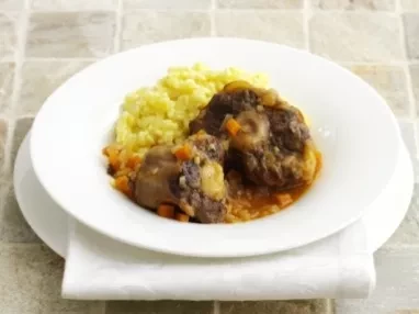 4. Add the Osso Buco, stock and season with salt and pepper. Bring to the boil then reduce the heat to a gentle simmer, cover and cook for 90 minutes. Check the stew from time to time to ensure the mixture has not become too dry; if it has, add a little more stock.
