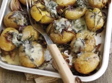 Remove from the oven and gently crush the potatoes and top with crumbled Gorgonzola. Return to the oven for 3-5 minutes until the Gorgonzola has melted and is bubbling.