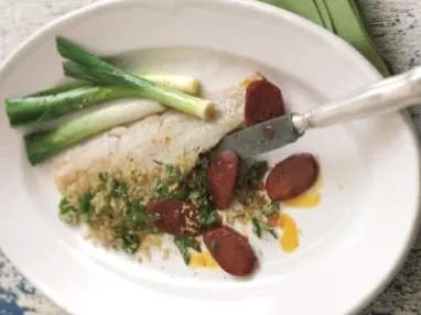 5. Serve the pollock fillets with a spoonful of breadcrumbs, baby leeks, chorizo, a drizzle of chorizo oil and a squeeze of lemon juice.