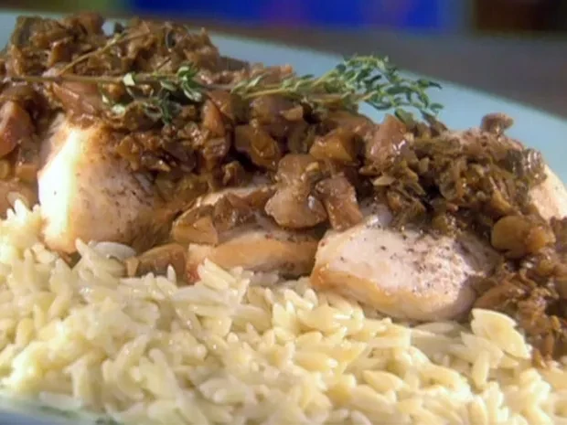 Pan-seared chicken with porcini-chestnut sauce with steamed spinach and orzo