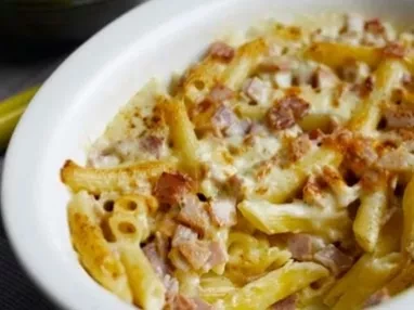 Put the pasta in the oven tray, cover with the ham, the mixture and finally the cheese.