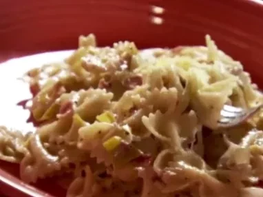 Saute the pancetta in a large skillet over medium heat until the fat is rendered and it starts to brown. Add the leeks and cook, about 8 minutes. When you add the leeks, you can also throw in a pat or 2 of butter if you want to. This'll give the dish some scrumptious flavor.