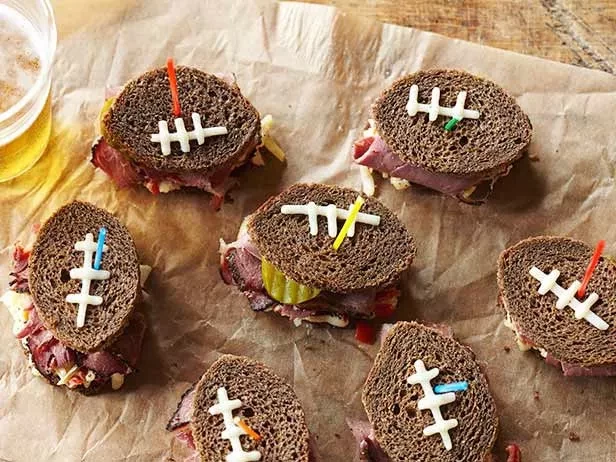Stack 4 slices of the bread on a cutting board. Using a knife or 2 1/2-inch round cutter, trim the bread into football shapes, save the trimmings for another use. Continue with the remaining bread.