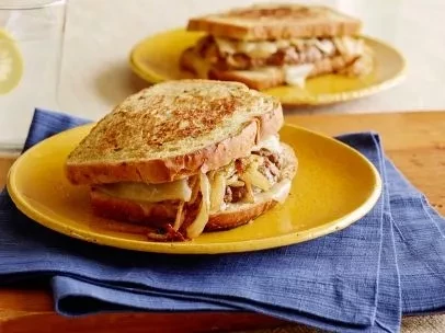 4. Assemble the patty melts this way: Slice of bread, slice of cheese, hamburger patty, a quarter of the cooked onions, another slice of cheese and another slice of bread.