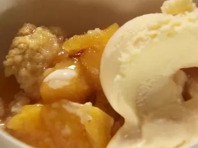 Bake until golden brown and bubbly, 30 to 35 minutes. Allow to sit for 10 to 15 minutes before serving. If the cobbler is too juicy, use a turkey baster to remove a little of the juice (or spoon the juice over ice cream). Serve warm with vanilla ice cream or fresh whipped cream.
