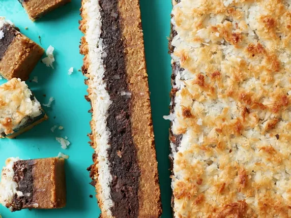 5. Bake until the center doesn't jiggle when the pan is shaken and the coconut is golden brown, 1 hour 10 minutes to 1 hour 20 minutes. (A knife inserted in the middle will still come out wet, because the brownie layer is super fudgy. The jiggle cue is the key to determining doneness.)