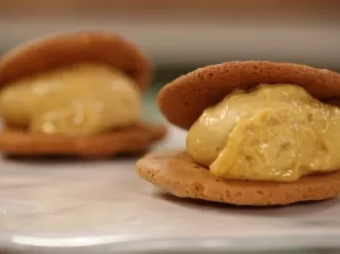 5. When they come out the oven they will be slightly soft in the middle, giving you a chewy, crunchy cookie. Leave them to cool on a cooling rack. Spoon a layer of ice cream onto the base of one cookie and sandwich another cookie on top.