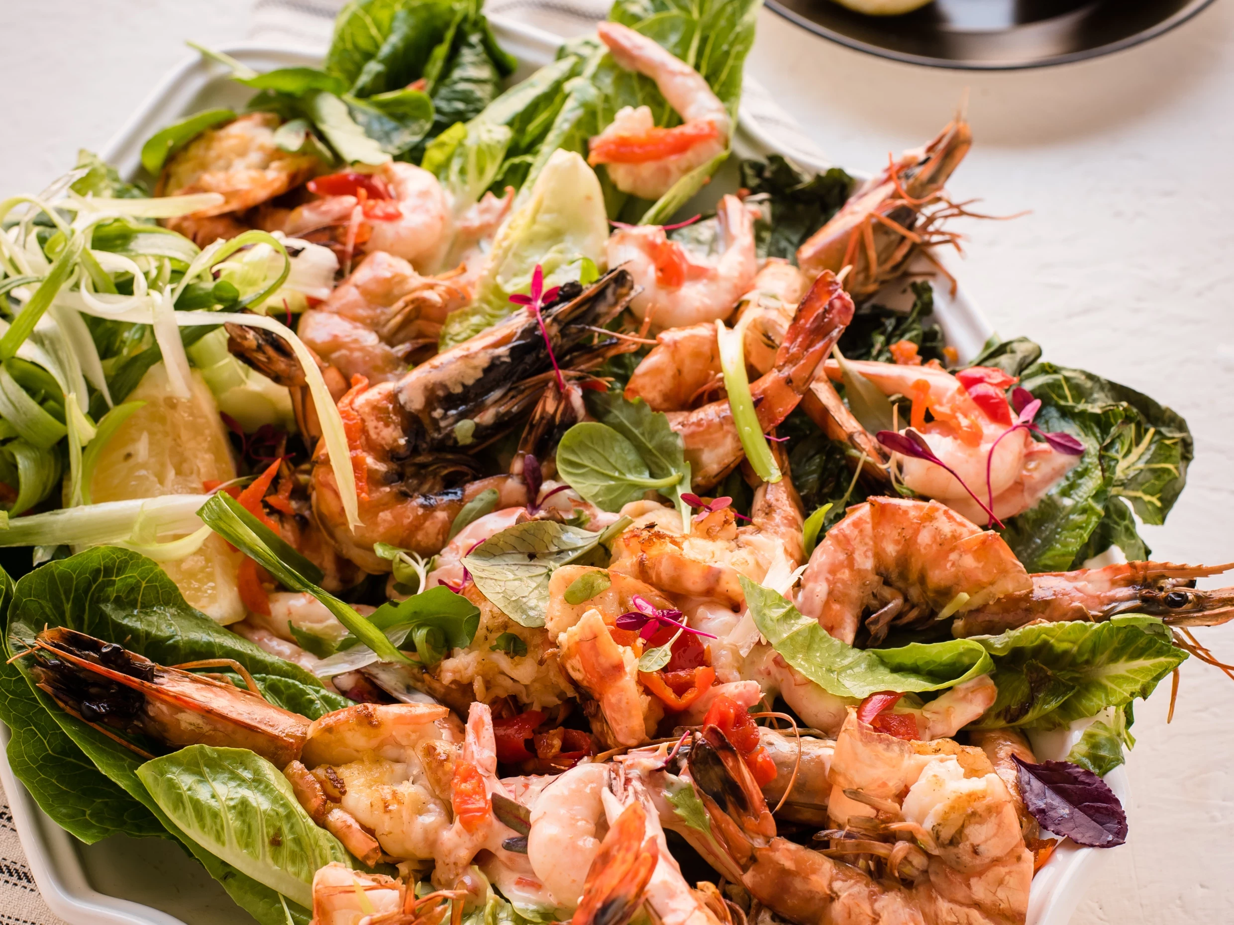 - To assemble, arrange the grilled lettuce on a platter, and spoon over the prawn mayo. Spoon the remaining sauce into a bowl. Arrange the grilled prawns on the platter.