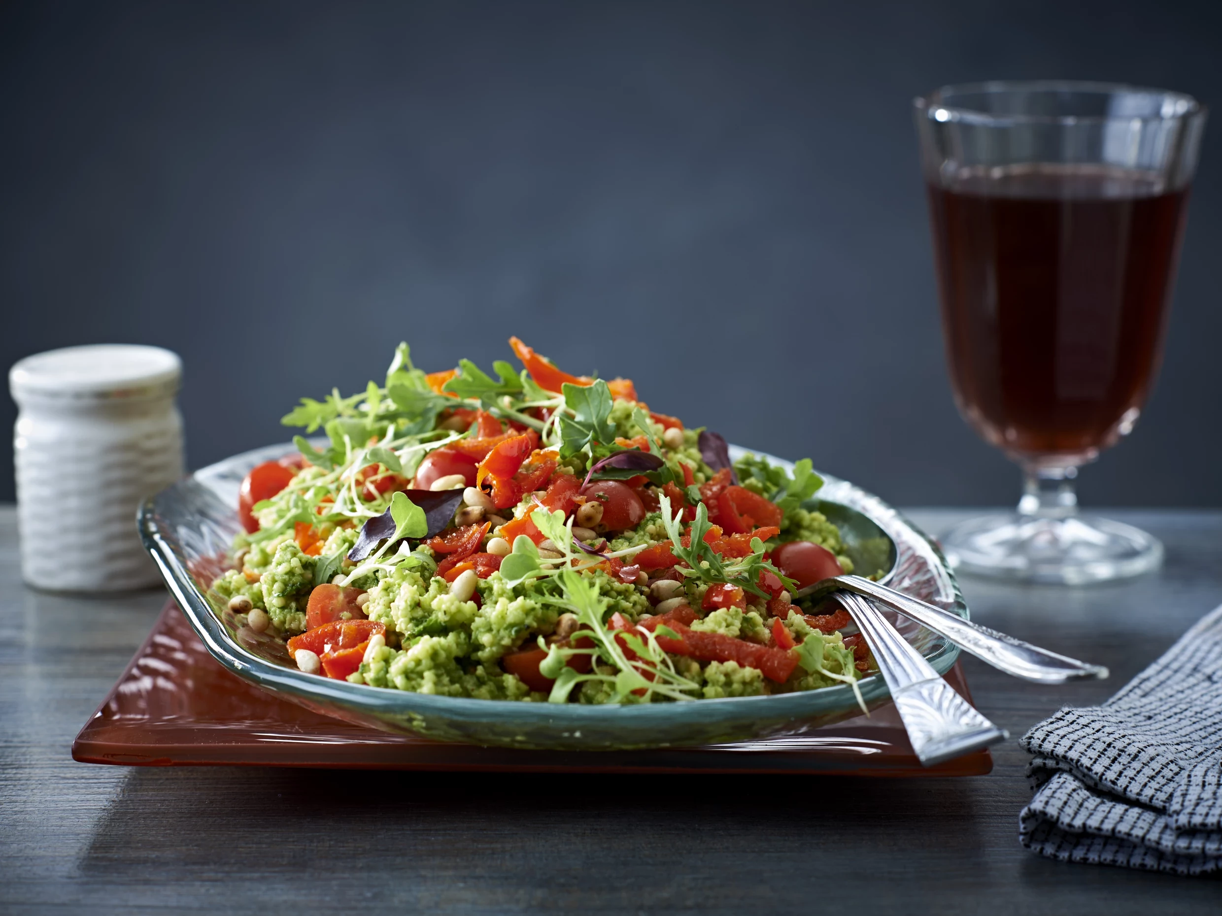 - Add the baby marrow, green beans, PEPPADEW® Mild Piquanté Peppers Chopped, pine nuts, red onion garlic and lemon juice, and mix well.