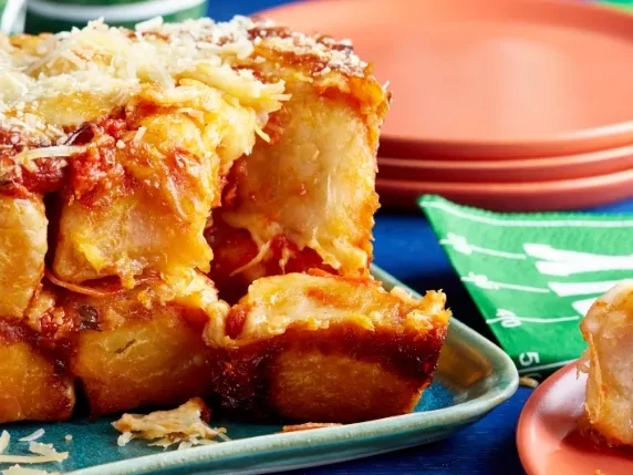 6. Arrange the pesto pinwheels around the camembert, alternating colours to create a wreath shape. Brush with the beaten egg yolks and sprinkle with reserved mozzarella.