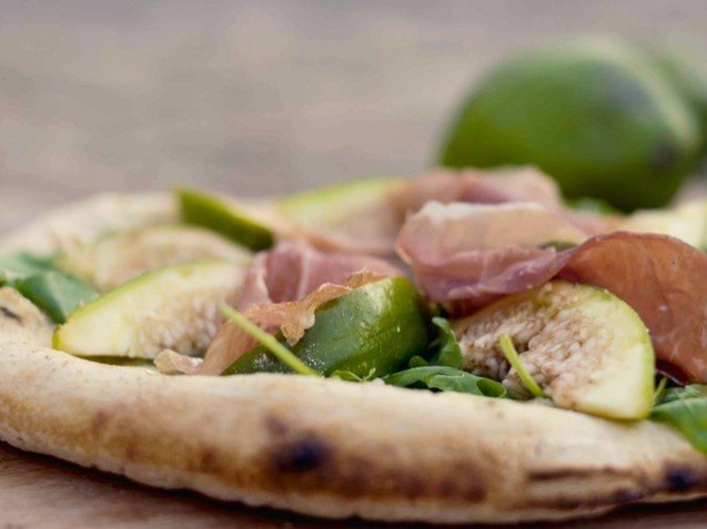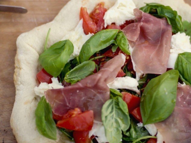 2. Briefly knead the dough until you have a smooth ball, about 30 seconds. Divide the pizza dough in half and on a floured surface, roll out the first piece of dough to a 50cm x 30cm rectangle (approximately), about 0.5mm in thickness.